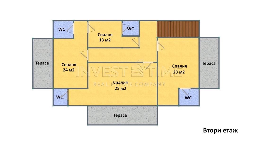 – Втори етаж: коридор, 4 спални (13, 23, 24 и 25 м2), всяка със собствено санитарно помещение, три големи тераси.