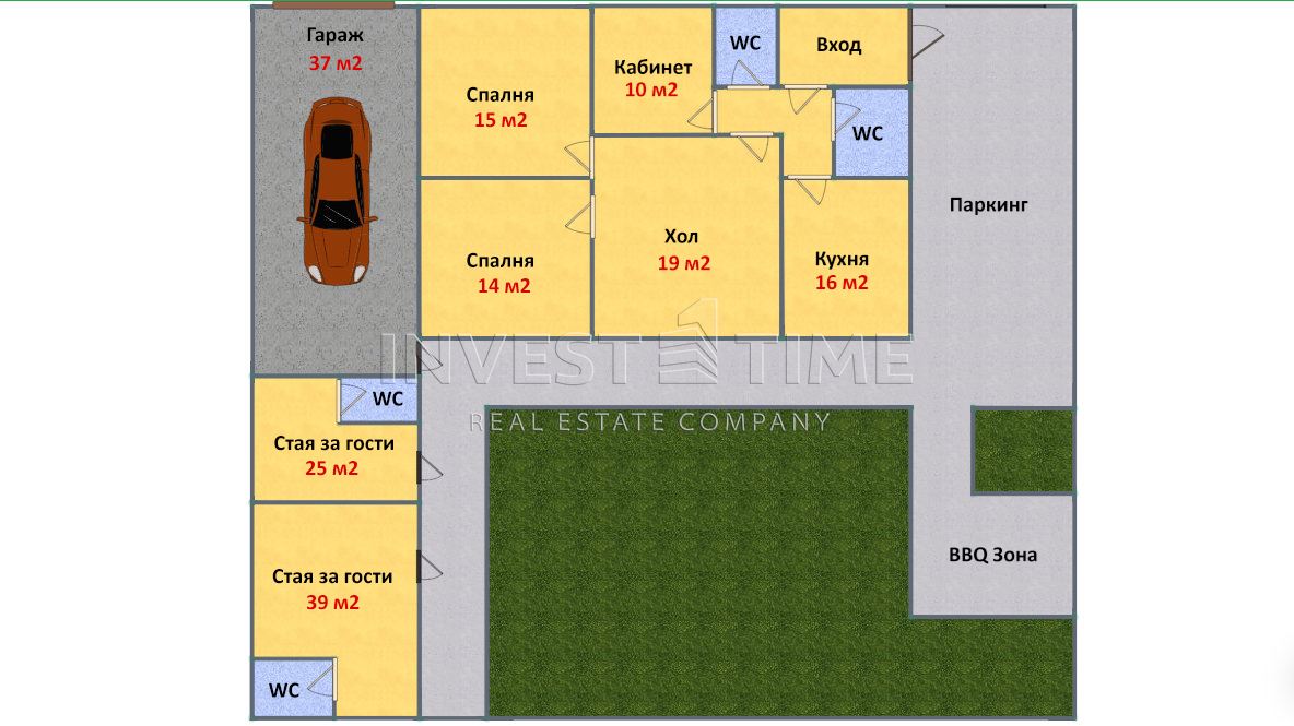 – Първи етаж: стълбище, коридор, кухня с трапезария (16 м2), хол с излаз на тераса (19 м2), 3 спални (10,14 и 15 м2), две санитарни помещения на етажа.